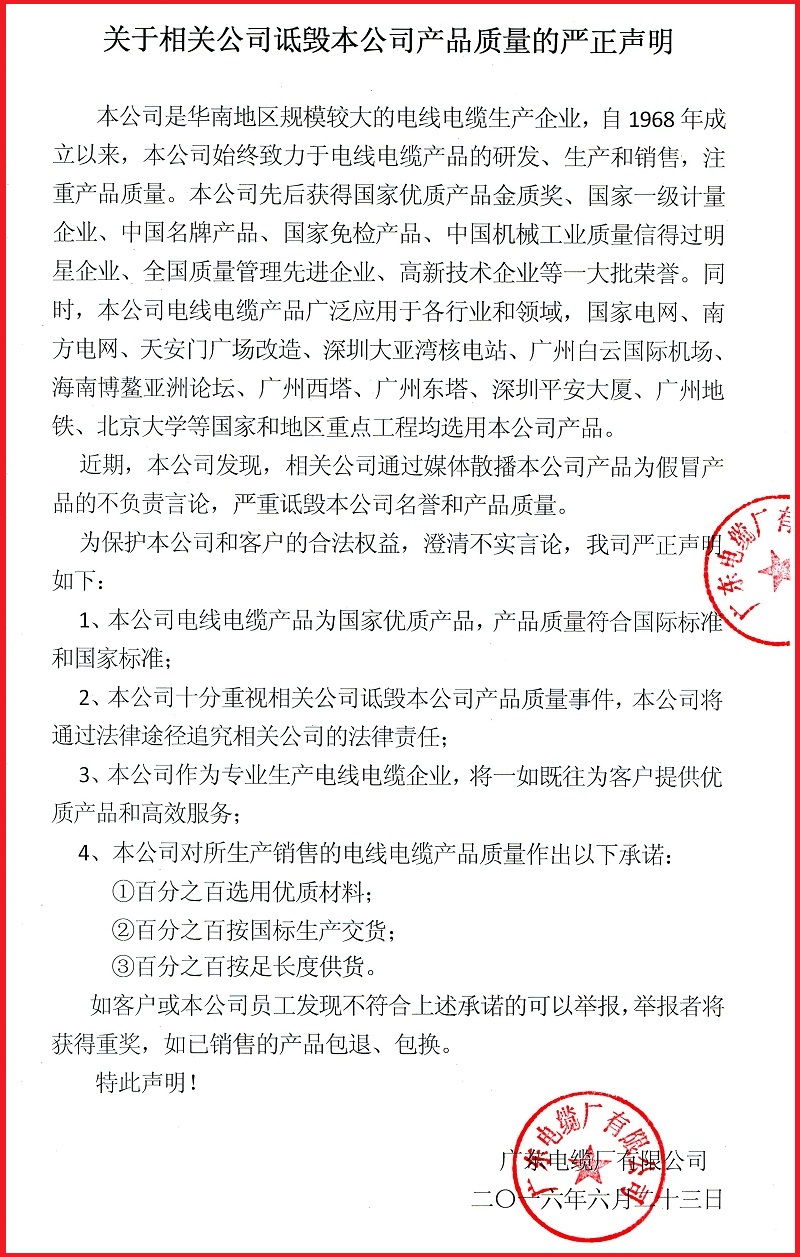 摘要:本公司是华南地区规模较大的电线电缆生产企业,自1968年成立以来,本公司始终致力于电线电缆产品的研发、生产和销售,注重产品质量。本公司先后获得国家优质产品金质奖、国家一级计量企业、中国名牌产品、国家免检产品、中国机械工业质量信得过明星企业、全国质量管理企业、高新技术企业等一大批荣誉。同时,本公司电线电缆产品广泛应用于各行业和领域,国家电网、南方电网、天安门广场改造、深圳大亚湾核电站、广州白云国际机场、海南博鳌亚洲论坛、广州西塔、广州东塔、深圳平安大厦、广州地铁、北京大学等国家和地区重点工程均